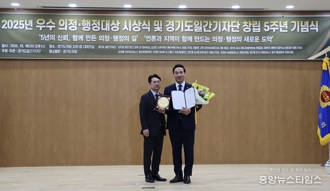 (중앙뉴스타임스 = 방재영 기자) 김용성 경기도의원(더불어민주당, 광명4)이 10일 경기도의회 대회의실에서 열린 2025년 우수의정·행정대상 시상식에서 보건복지위원회 대표의원으로 ‘경기도의회 우수의정 그랜드마스터상’을 수상했다.