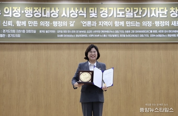 (중앙뉴스타임스 = 방재영 기자) 경기도의회 교육행정위원회 이애형 위원장(국민의힘, 수원 세류1·2·3동 및 권선1동)은 10일 경기도일간기자단이 주관한 ‘2025년 우수 의정·행정대상 시상식 및 창립 5주년 기념식’에서 ‘경기발전 그랜드마스터상’을 수상했다.