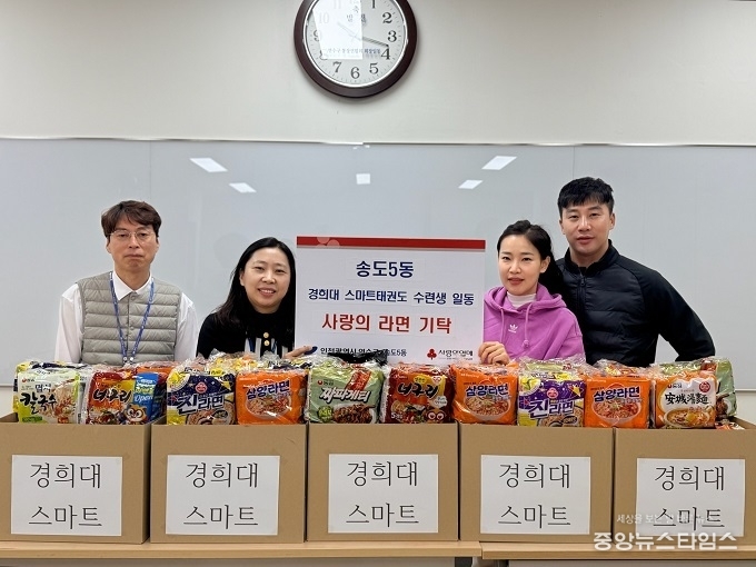 (중앙뉴스타임스 = 방재영 기자) 인천 연수구 송도5동 지역사회보장협의체(위원장 강지행·한지원)는 지난 15일 경희대 스마트 태권도(원장 고미성) 수련생들로부터 ‘사랑의 라면’ 약 250개를 기탁받았다.