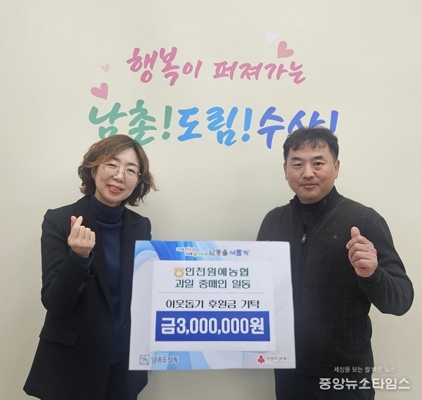 (중앙뉴스타임스 = 방재영 기자) 인천 남동구 남촌도림동 행정복지센터는 남촌농산물도매시장 인천원예농협(조합장 양만수)의 과일 중매인 30명이 이웃돕기 후원금 300만 원을 기탁했다고 18일 밝혔다.