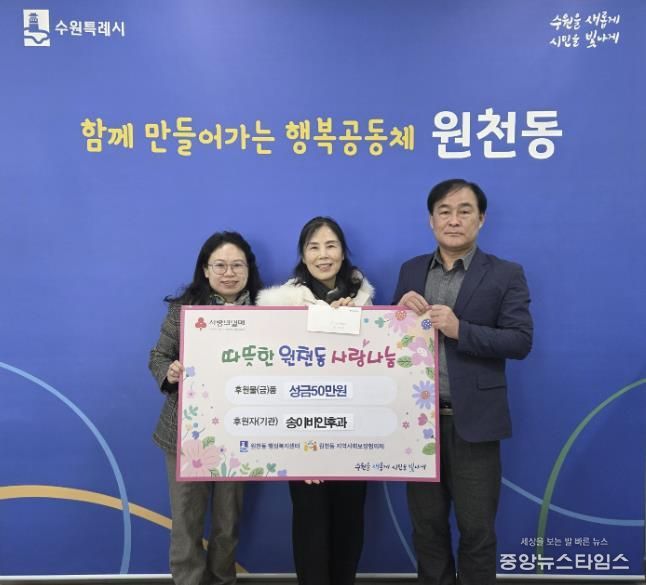 (중앙뉴스타임스 = 방재영 기자) 수원시 영통구 원천동에 소재한 송이비인후과는 지난 18일 지역사회 나눔 실천의 일환으로 원천동행정복지센터에 성금 50만 원을 기부했다.