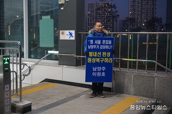 이원호 변호사는 앞서 서울시청 앞 1인 시위를 시작으로, 감차 계획이 철회될 때까지 매일 아침 별내역과 다산역에서 출근 시간대 1인 시위를 이어오며 시민들의 불편과 분노를 현장에서 직접 전달해 왔다. 이 변호사는 “별내선은 경기도와 구리시, 남양주시가 건설비와 운영비를 분담해 개통한 광역철도임에도 불구하고, 서울시와 서울교통공사가 사전 협의 없이 일방적으로 운행 계획 변경을 추진한 것은 명백히 잘못된 행정이었다”고 지적했다.