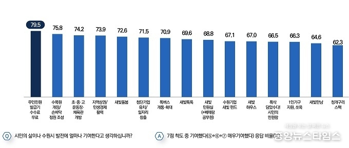 민선 8기 주요 시책 중 시민 삶·수원시 발전에 기여도가 가장 높은 정책으로 ‘무인민원발급기 수수료 무료’가 79.5%를 꼽았다. 수목원 개장/손바닥정원 조성(75.8%), 초중고교 운동장·체육관 개방(74.2%), 지역 상권/민생경제 활성화(73.9%) 등이 뒤를 이었다.