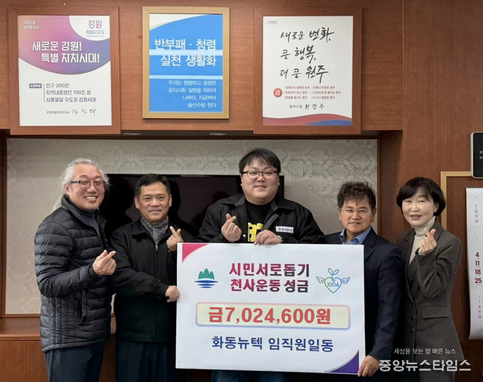 (중앙뉴스타임스 = 방재영 기자)‘화동뉴텍’ 임직원 일동은 지난 12월 29일 원주시청 복지국장실에서 천사운동 후원금 702만 4600원을 후원했다.
