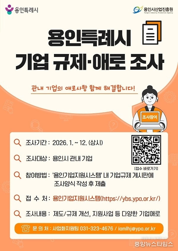 (중앙뉴스타임스 = 방재영 기자) 용인시산업진흥원은 2026년 새해를 맞아 기업의 경영 걸림돌을 해소하고 현장의 생생한 목소리를 정책에 반영하기 위해 '찾아가는 기업 현장 간담회'와 '기업 규제·애로 조사'를 본격 가동하며 현장 대응 체계를 한층 강화한다고 13일 밝혔다.