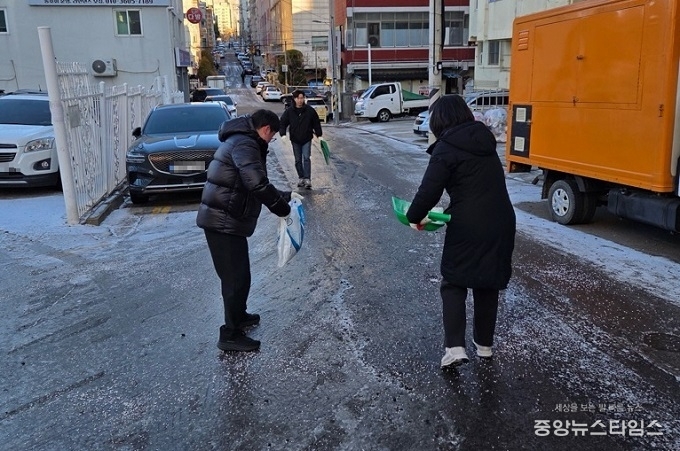 (중앙뉴스타임스 = 방재영 기자) 인천 남동구 구월3동 행정복지센터는 강설 이후 도로 및 보행로에 발생한 결빙 구간을 대상으로 신속한 제설 작업을 실시했다고 14일 밝혔다.