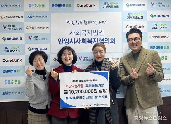 (중앙뉴스타임스 = 방재영 기자) 안양시사회복지협의회(회장 김광진)와 (주)폴라레나엠케이(대표 이예나)는 지난 22일 사회복지협의회에서 2026년 희망나눔사업 일환으로 ‘복지소외계층을 위한 폴라레나 향균 샤워티슈’기부 전달식을 진행됐다.