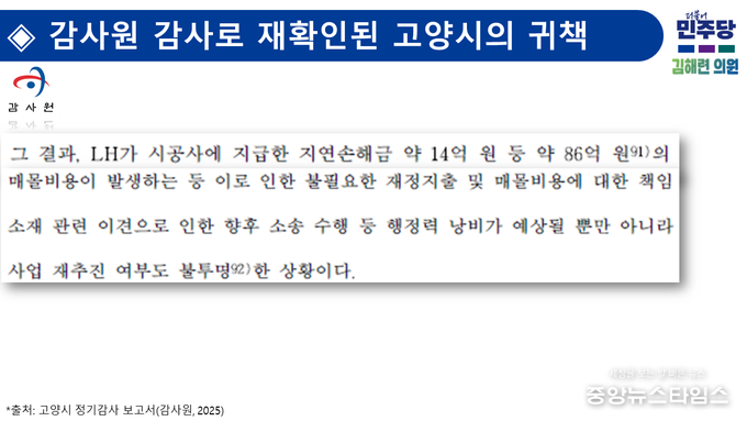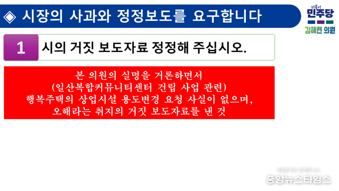 (중앙뉴스타임스 = 방재영 기자) 고양특례시의회 건설교통위원회 김해련 의원(일산2동·정발산동·중산1·2동)은 지난 23일 열린 제301회 임시회 제1차 본회의 5분 자유발언을 통해 감사원 감사로 재확인된 일산 도시재생 지연의 귀책이 이동환 시장과 고양시에 있음을 강조하고 유감 표명과 정정보도를 요구했다.