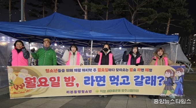 (중앙뉴스타임스 = 방재영 기자) 직장·공장새마을운동 양주시협의회와 리본동행청소년은 26일 옥정동 호수공원 일대에서 관내 비행·위기청소년을 대상으로 ‘월요일 밤, 라면 먹고 갈래?’ 봉사활동을 진행했다.