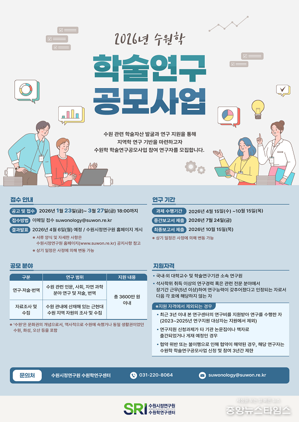 (중앙뉴스타임스 = 방재영 기자) 수원시정연구원 수원학연구센터가 ‘2026년 수원학 학술연구공모사업’을 추진하며 신규 연구과제를 공모한다고 27일 밝혔다. 수원과 관련된 연구과제를 발굴·지원해 수원학의 전문성을 높이고 연구자 육성을 돕기 위한 사업이다.