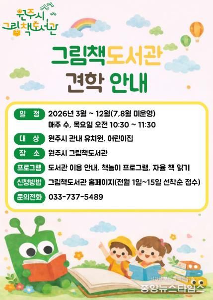 (중앙뉴스타임스 = 방재영 기자) 원주시 그림책도서관은 오는 3월부터 12월까지 관내 유치원과 어린이집을 대상으로 어린이 견학 프로그램을 운영한다고 2일 밝혔다.