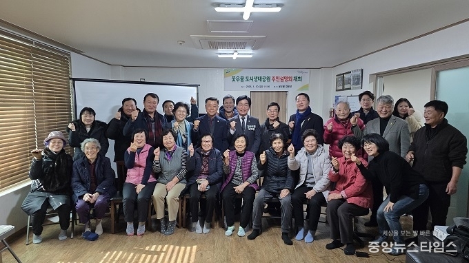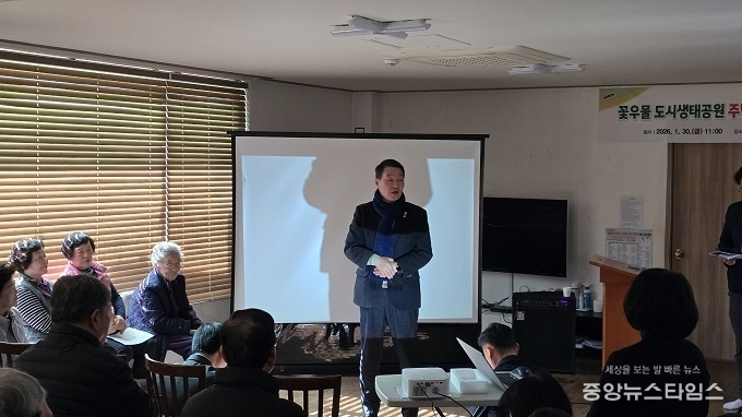 (중앙뉴스타임스 = 방재영 기자) 경기도의회 강태형 의원(더불어민주당, 안산5)은 경기도 특별조정교부금 확보에 따라 추진되는 ‘꽃우물 도시생태공원 조성사업’과 관련해 지난 30일 안산시 단원구 선부3동 꽃우물 경로당에서 열린 주민설명회에 참석해 지역 주민들과 함께 사업 추진 현황을 공유하고 향후 조성 방향에 대한 의견을 나눴다.