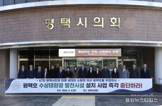 (중앙뉴스타임스 = 방재영 기자) 평택시의회는 2월 3일, 시의회 본관 앞에서‘평택호 수상태양광 발전시설 설치 중단 촉구 성명서’를 발표했다.