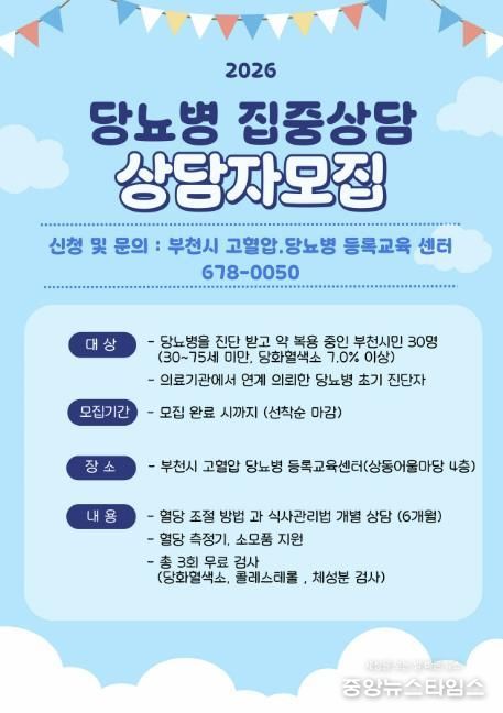 신청 대상은 30세 이상 75세 미만으로, 당화혈색소 7.0% 이상인 당뇨병을 진단받은 부천시민이다. 참여자로 선정되면 간호사와 영양사로 구성된 건강매니저가 팀을 이뤄 6개월간 개별 맞춤형 관리를 지원한다. 신청은 유선을 통해 가능하며, 모집은 선착순으로 완료 시까지 진행된다.