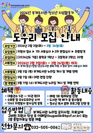(중앙뉴스타임스 = 방재영 기자) 부평구립 부개도서관은 오는 26일까지 청소년 자원활동가 ‘도우리’를 모집한다.