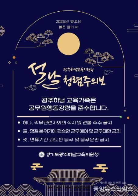 (중앙뉴스타임스 = 방재영 기자) 경기도광주하남교육지원청은 2월 9일, 2026년 병오년 설명절을 맞아 관내 교직원들이 청렴한 마음가짐으로 새해를 시작할 수 있도록‘교육장 청렴서한문’과‘청렴주의보’를 각급 학교에 전달했다.