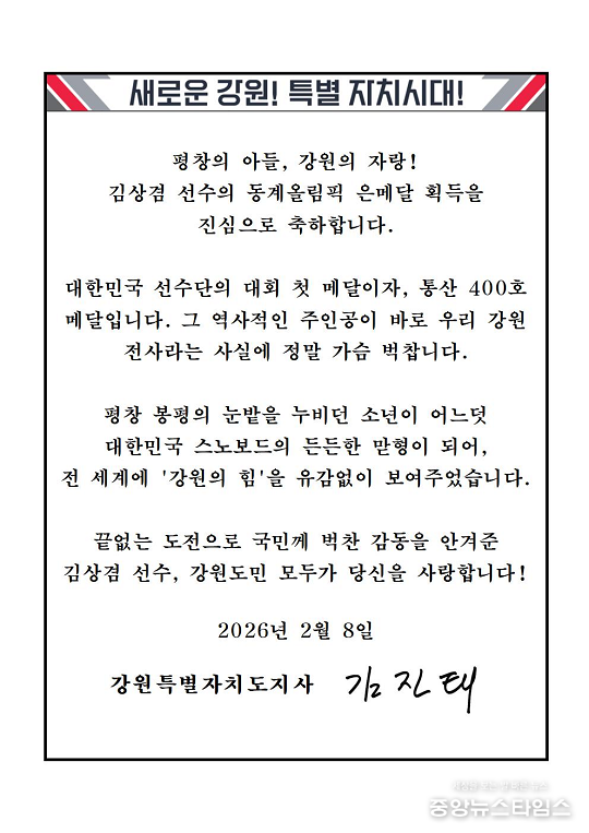 (중앙뉴스타임스 = 방재영 기자) 김진태 강원도지사는 8일 2026 밀라노-코르티나담페초 동계올림픽대회에서 강원특별자치도(하이원 스포츠단) 소속 김상겸 선수의 남자 스노보드 평행대회전 은메달 획득을 축하하며, 축전을 보냈다.