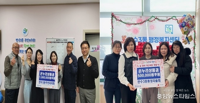 (중앙뉴스타임스 = 방재영 기자) 인천 남동구 만수3동 행정복지센터는 주민자치회(회장 이수빈)와 통장자율회(회장 문미경)로부터 어려운 이웃을 위한 온누리상품권을 기탁받았다고 10일 밝혔다.