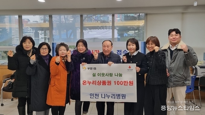 (중앙뉴스타임스 = 방재영 기자) 인천 부평구 부평1동은 10일 인천나누리병원으로부터 설 명절 이웃사랑 나눔을 위한 온누리상품권 100만 원을 기탁받았다고 밝혔다.