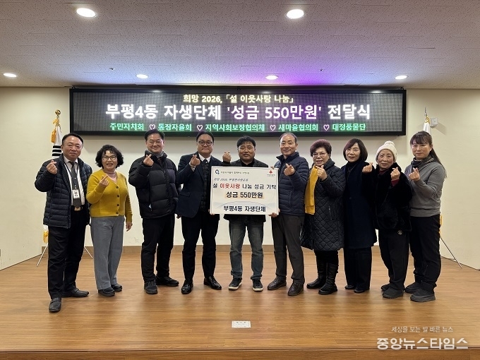 (중앙뉴스타임스 = 방재영 기자) 인천 부평구 부평4동은 10일 설 명절을 맞아 지역 내 자생단체들로부터 어려운 이웃을 돕기 위한 성금 총 550만 원을 기탁받았다고 밝혔다.