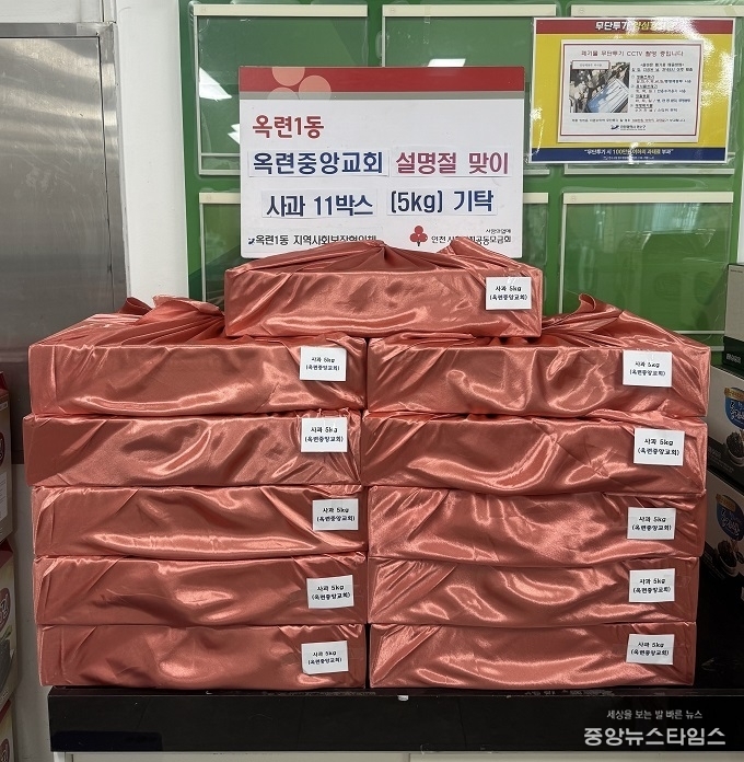 (중앙뉴스타임스 = 방재영 기자) 인천 연수구 옥련1동 지역사회보장협의체(위원장 백영실·박종상)와 옥련2동 지역사회보장협의체(위원장 김영미·박인규)는 지난 9일 옥련중앙교회(담임목사 한종근)로부터 사과 11박스를 각각 전달받았다.