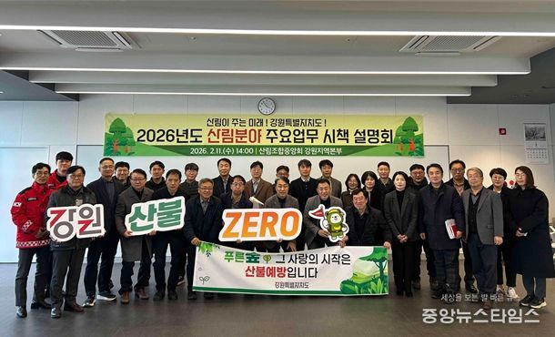 (중앙뉴스타임스 = 방재영 기자) 강원특별자치도는 2월 11일 춘천시 소재 산림조합중앙회 강원지역본부에서 도 산림부서 및 시군 산림부서장 등 산림 관계자 70여 명이 참석한 가운데 ‘2026년 산림분야 주요업무 시책설명회’를 개최했다.
