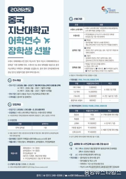 (중앙뉴스타임스 = 방재영 기자) 수원특례시는 오는 20일까지 ‘2026년도 지난대학교 어학연수 장학생 프로그램’ 참가자 1명을 모집한다고 12일 밝혔다.
