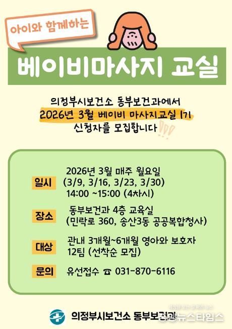 (중앙뉴스타임스 = 방재영 기자) 의정부시 보건소는 오는 24일부터 ‘베이비 마사지교실’ 1기 프로그램에 참여할 3~6개월 영아와 보호자 12팀을 모집한다고 19일 밝혔다.