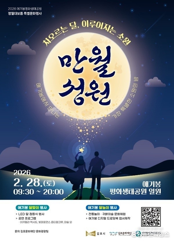(중앙뉴스타임스 = 방재영 기자) 김포시는 오는 28일 글로벌 복합문화 명소로 뜨고 있는 애기봉에서 세계인이 함께 즐기는 정월대보름 특별행사 ‘만월성원’ 행사를 개최한다고 23일 밝혔다.