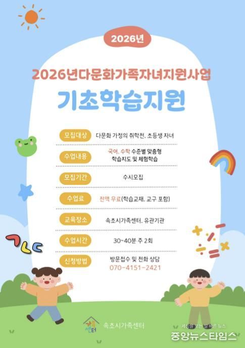 (중앙뉴스타임스 = 방재영 기자) 속초시가족센터는 다문화가족 자녀들의 안정적인 학교생활 적응과 기초학력 증진을 위해 ‘2026년 다문화가족 자녀 기초학습지원사업’을 본격적으로 추진한다고 24일 밝혔다.