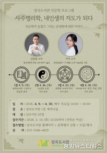 (중앙뉴스타임스 = 이광운 기자) 김포시 양곡도서관은 오는 4월 9일부터 30일까지 매주 목요일, 인문학 강좌 '사주명리학, 내 인생의 지도가 되다'를 운영한다고 5일 밝혔다.
