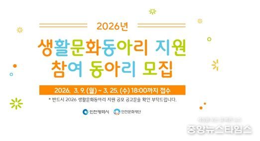 (중앙뉴스타임스 = 방재영 기자) 인천시와 인천문화재단은 인천 시민들의 자발적인 문화예술 활동을 지원하기 위해 '2026 생활문화동아리 지원' 사업을 추진한다고 11일 밝혔다.