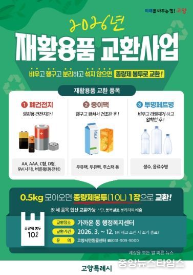 (중앙뉴스타임스 = 방재영 기자) 고양특례시 덕양구 창릉동은 주민들의 자원 재활용 참여를 확대하고 올바른 분리배출 문화를 정착시키기 위해 ‘2026년 재활용품 교환사업’을 운영한다고 밝혔다.
