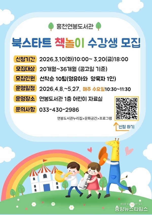 (중앙뉴스타임스 = 방재영 기자) 홍천군은 영유아의 독서 흥미를 높이고 보호자와 아이가 함께 책과 친해질 수 있도록 2026년 상반기 '북스타트 책놀이' 프로그램 수강생을 모집한다고 12일 밝혔다.