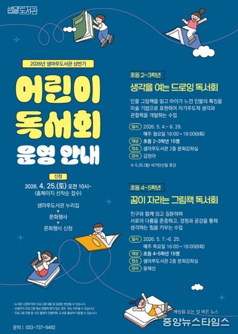 (중앙뉴스타임스 = 방재영 기자) 원주시 샘마루도서관은 오는 5월부터 6월까지 관내 어린이를 대상으로 ‘상반기 어린이 독서회’을 운영한다고 25일 밝혔다.