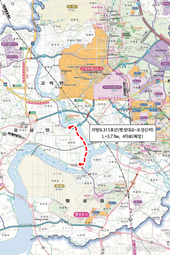 (중앙뉴스타임스 = 방재영 기자) 평택시가 경기도의 ‘제4차 도로건설계획(2026~2030)’에 지방도 315호선 ‘팽성대교~오성 신리’구간 확장사업이 최종 반영됐다고 25일 밝혔다.