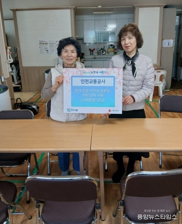 (중앙뉴스타임스 = 방재영 기자) 인천 남동구 만수4동 행정복지센터는 최근 인천교통공사(사장 최정규)가 ‘만수주공 11단지 경로당’에 입식 식탁·의자 세트를 후원했다고 25일 밝혔다.