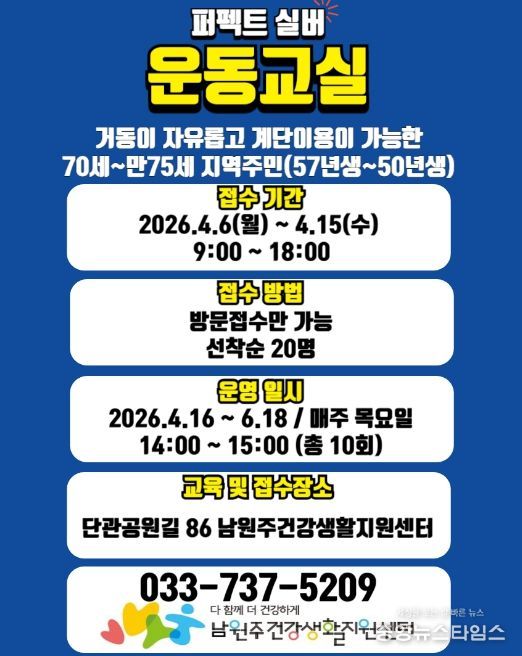 모집 대상은 자발적 거동이 가능하고, 계단 이동이 자유로운 70∼75세(1950∼1957년생) 지역 주민 선착순 20명 내외다. 4월 6일부터 15일까지 센터를 방문해 신청할 수 있다. 자세한 사항은 남원주건강생활지원센터로 문의하거나 센터 밴드를 확인하면 된다.