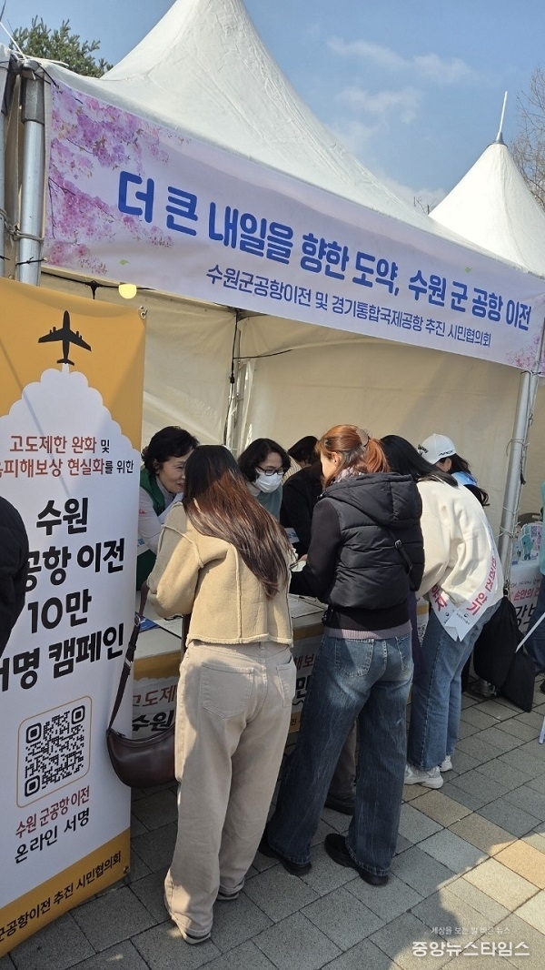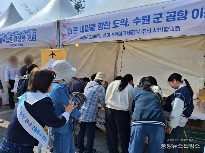 (중앙뉴스타임스 = 방재영 기자) 수원군공항 이전 및 경기통합국제공항 추진 시민협의회(회장 조철상)는 4일 만석공원에서 열린 ‘2026 만석거 새빛축제’에서 군공항 이전과 경기통합국제공항 건설을 촉구하는 ‘10만 서명운동’ 홍보 부스를 운영하며 시민들과 적극적으로 소통했다.