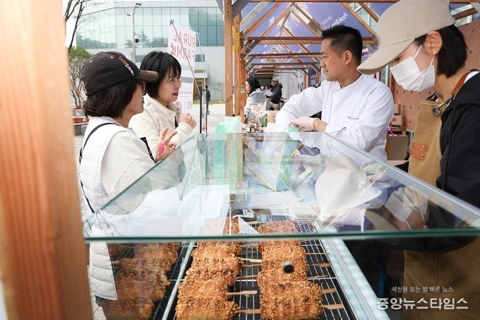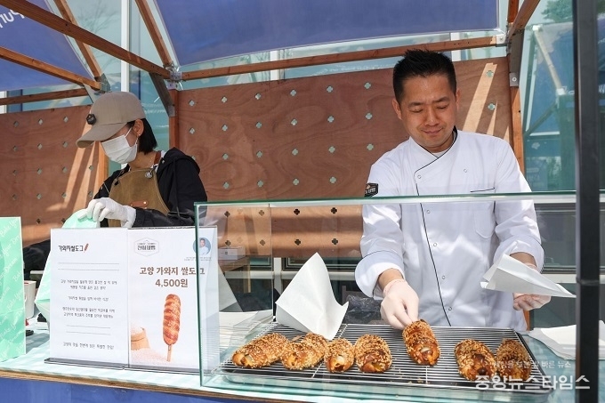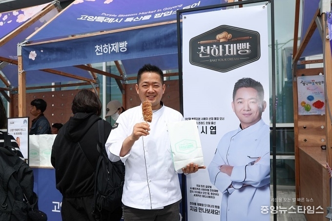 (중앙뉴스타임스 = 방재영 기자) 고양특례시 특산물 팝업스토어가 진행 중인 일산서구청 광장에서 11일 ‘고양 가와지쌀도그’ 부스에 천하제빵 김시엽 셰프가 깜짝 등장해 눈길을 끌었다.