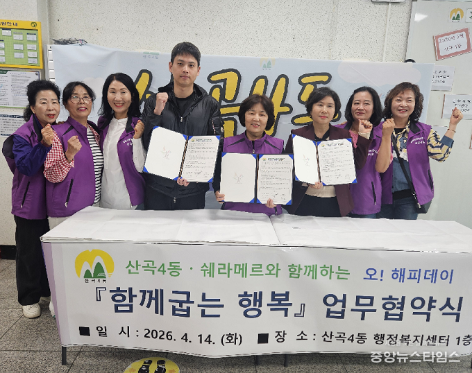 (중앙뉴스타임스 = 방재영 기자) 인천 부평구 산곡4동 지역사회보장협의체는 14일 지역 내 제과점 쉐라메르와 ‘오 해피데이, 함께 굽는 행복’ 사업 추진을 위한 업무협약을 체결했다.