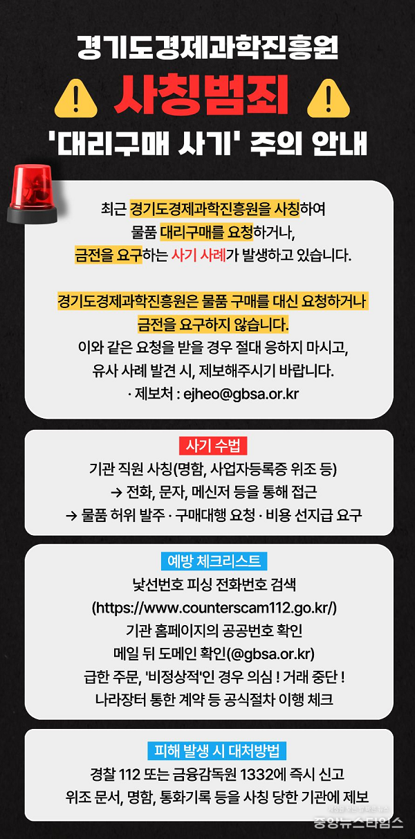 (중앙뉴스타임스 = 방재영 기자) 경기도경제과학진흥원(이하 경과원)은 최근 기관 직원을 사칭한 대리구매 사기 피해 사례가 확인됨에 따라 기업을 대상으로 예방 안내를 강화하고 각별한 주의를 당부했다.