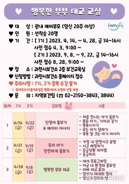 과천시 보건소 관계자는 “이번 교육이 행복한 마음으로 우리 아이들을 기다리는 예비 부모님들께 유익한 내용이 될 것으로 기대한다. 많은 예비 부모님들의 관심과 참여를 부탁드린다”라고 말했다.