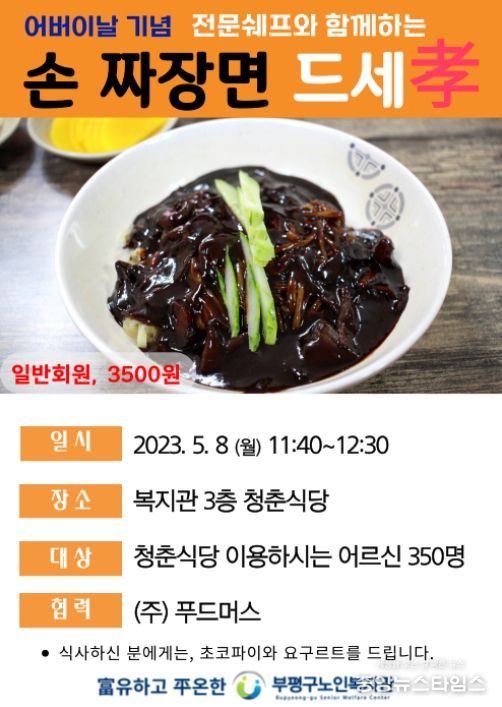 ‘손 짜장면 드세孝’는 (주)푸드머스와 협업으로 전문 쉐프가 직접 손 짜장면과 수제 탕수육 요리를 만들어 대접하여 어르신에게 추억을 되 내이고 행복을 느낄 수 있도록 맛있고 독특함을 전하는 이벤트로 진행한다.