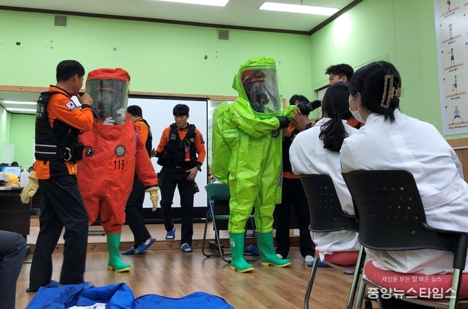 지난 7월 발생한 국제 우편물 테러 의심 사건 등으로 생물테러에 대한 사회적 관심이 높아진 상황 속에서 진행된 이번 훈련에서는 실제 테러가 발생한 상황을 가정해 ▲생물테러 대응체계 교육 ▲개인 보호복(Level A&C) 착탈의 ▲다중탐지키트 및 검체 채취 이송 등 보건소 초동대응요원 중심으로 실습형 훈련을 진행했다.