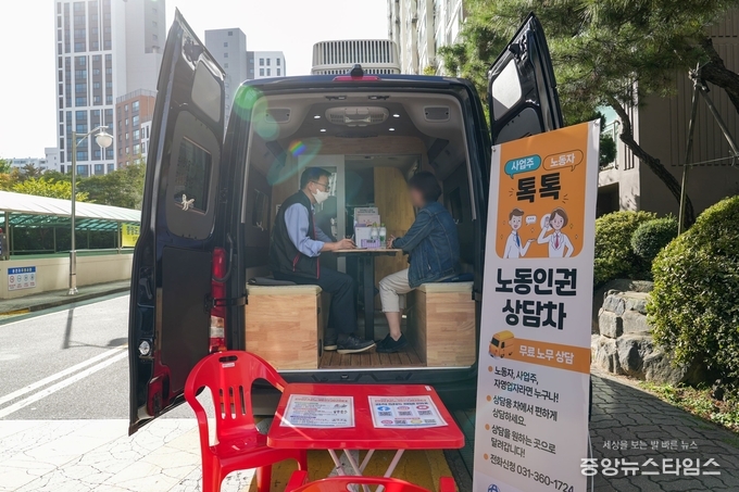 찾아가는 상담은 대상자의 비밀보장을 위해 상담용으로 개조된 ‘톡톡 노동인권 상담차’ 안에서 진행돼 부담 없이 참여할 수 있다. 이날에는 총 8명이 상담차를 찾아 상담을 진행했다.