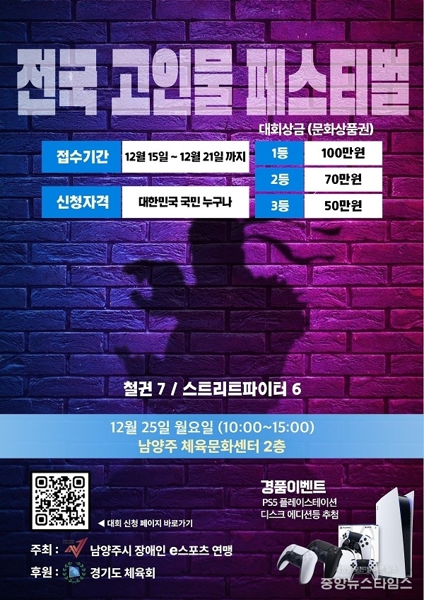 (중앙뉴스타임스 = 방재영 기자) 남양주시장애인e스포츠연맹(회장 이현경)은 오는 25일 남양주체육문화센터에서 ‘제1회 전국고인물페스티벌’을 개최한다.
