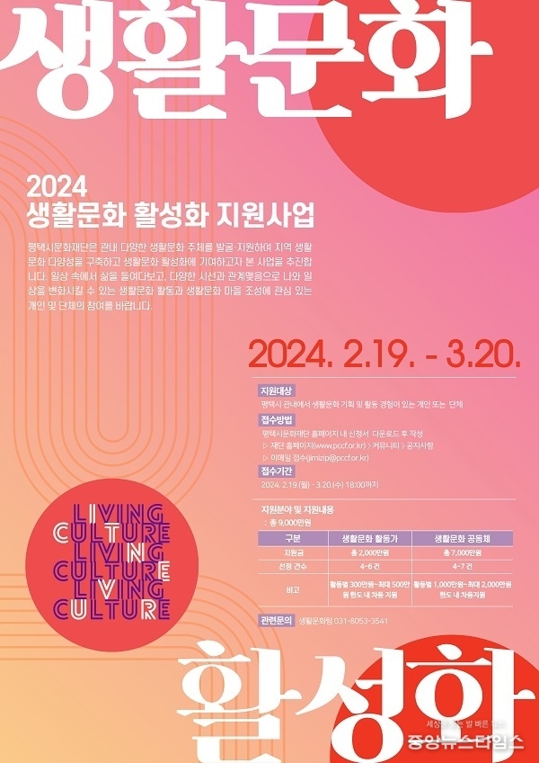 (중앙뉴스타임스 = 방재영 기자) 평택시문화재단은 평택시 생활문화의 다양화와 활성화를 위해 오는 3월 20일까지 ‘2024년 생활문화 활성화 지원사업’을 공모한다고 21일 밝혔다.