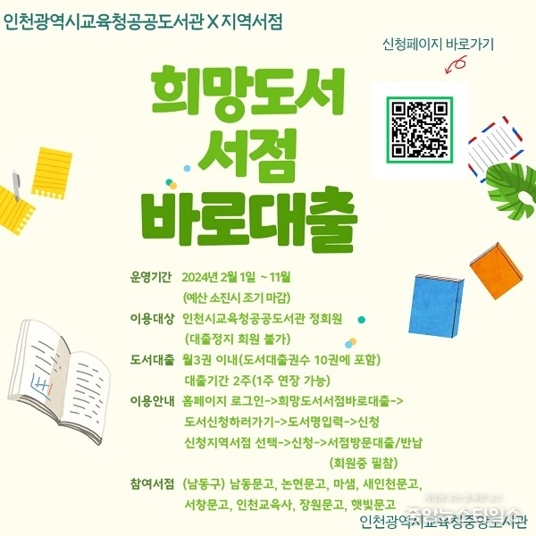 (중앙뉴스타임스 = 방재영 기자) 인천시교육청중앙도서관은 올해 희망도서 서점 바로대출 서비스 협약 서점을 확대 운영한다고 22일 밝혔다.