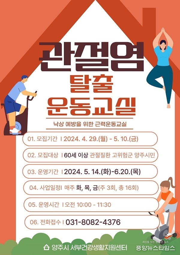 (중앙뉴스타임스 = 방재영 기자) 경기 양주시가 오는 5월 10일까지 관내 60세 이상 관절질환 고위험군을 대상으로 ‘2024년 관절염 탈출 운동 교실’ 1기 참여자를 모집한다고 30일 밝혔다.